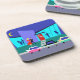 This Retro Open House Party Plastic Coasters will put you in the partying mood. The cartoon design features the exterior of a mid century modern house. Through the floor to ceiling turquoise glass walls, we can see the navy blue silhouettes of festive party goers. There is a couple chatting in front of a window. On the opposite side of the room, we can see a dancing man and the long-winded man everyone is trying to avoid. The exterior of the house features a cheery red door and an oversize purple brick chimney. A grey walkway is cutting a swath to the front door, through the teal grass. The nighttime scene has a dark blue sky with a yellow, crescent moon. An attractive couple is doing the cha-cha-cha on the way to their car. The blond woman is wearing a bright red dress. Her handsome escort is wearing a black suit and a red tie. His hands are wrapped around the woman's waist. On the street, in front of the house, we can see three, brightly colored classic cars. Order today and party like it's 1959!
