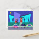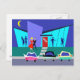 This Retro Open House Party Postcard will put you in the partying mood. The cartoon design features the exterior of a mid century modern house. Through the floor to ceiling turquoise glass walls, we can see the navy blue silhouettes of festive party goers. There is a couple chatting in front of a window. On the opposite side of the room, we can see a dancing man and the long-winded man everyone is trying to avoid. The exterior of the house features a cheery red door and an oversize purple brick chimney. A grey walkway is cutting a swath to the front door, through the teal grass. The nighttime scene has a dark blue sky with a yellow, crescent moon. An attractive couple is doing the cha-cha-cha on the way to their car. The blond woman is wearing a bright red dress. Her handsome escort is wearing a black suit and a red tie. His hands are wrapped around the woman's waist. On the street, in front of the house, we can see three, brightly colored classic cars. Order today and party like it's 1959!