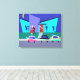 This Retro Open House Party Stretched Canvas Print will put you in the partying mood. The cartoon design features the exterior of a mid century modern house. Through the floor to ceiling turquoise glass walls, we can see the navy blue silhouettes of festive party goers. There is a couple chatting in front of a window. On the opposite side of the room, we can see a dancing man and the long-winded man everyone is trying to avoid. The exterior of the house features a cheery red door and an oversize purple brick chimney. A grey walkway is cutting a swath to the front door, through the teal grass. The nighttime scene has a dark blue sky with a yellow, crescent moon. An attractive couple is doing the cha-cha-cha on the way to their car. The blond woman is wearing a bright red dress. Her handsome escort is wearing a black suit and a red tie. His hands are wrapped around the woman's waist. On the street, in front of the house, we can see three, brightly colored classic cars. Order today and party like it's 1959!
