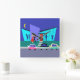 This Retro Open House Party Wall Clock will put you in the partying mood. The cartoon design features the exterior of a mid century modern house. Through the floor to ceiling turquoise glass walls, we can see the navy blue silhouettes of festive party goers. There is a couple chatting in front of a window. On the opposite side of the room, we can see a dancing man and the long-winded man everyone is trying to avoid. The exterior of the house features a cheery red door and an oversize purple brick chimney. A grey walkway is cutting a swath to the front door, through the teal grass. The nighttime scene has a dark blue sky with a yellow, crescent moon. An attractive couple is doing the cha-cha-cha on the way to their car. The blond woman is wearing a bright red dress. Her handsome escort is wearing a black suit and a red tie. His hands are wrapped around the woman's waist. On the street, in front of the house, we can see three, brightly colored classic cars. Order today and party like it's 1959!