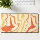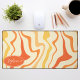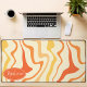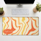 Add a splash of retro energy to your workspace with this vibrant groovy swirl desk mat. The design features a dynamic abstract pattern of wavy lines in shades of orange, yellow, and cream, capturing a playful 1970s aesthetic. A customizable oval nameplate in the corner provides a professional, personalized touch to your home office or creative studio. This mat offers a smooth surface for effortless mouse movement while protecting your desk from daily wear and tear. It is the perfect functional accessory for anyone looking to combine vintage style with modern productivity.