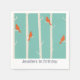 Personalized birthday paper napkins with an illustration of birch trees with orange birds sitting on their branches. Retro green colored background.