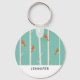A personalized keychain with an illustration of birch trees with orange birds sitting on their branches. Retro green colored background.
