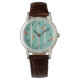 A watch with an illustration of birch trees with orange birds sitting on their branches. Retro green colored background.