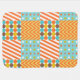 Retro inspired patchwork pattern featuring smaller patterns like chevron, stripes and polka dots. In this design you can also see colors like orange, aqua blue, mustard yellow, brown and white.