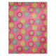 A beautiful whimsical vintage look pink tablecloth with lots of pretty snowflake orbs of mustard, aqua blue, and hot pink on a pink background.