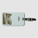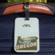 Stylish luggage tag features retro artistic Oregon state silhouette with text on light blue background. Personalize at top with monogram or name