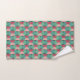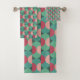 This towel set has a mid-century modern design of ovals with semi-circles inside them in retro Christmas colors.