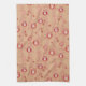 The kitchen towel features a pattern of several cheerful owls in retro warm colors among floral vines.