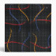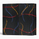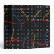 Retro 1980’s primary color paint strokes splatter pattern on a geometric black and white dotted background.