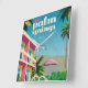Vintage Art Deco style illustration featuring a pink and orange hotel with swimming pool against a bright blue sky with palm trees