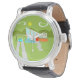 This Retro Palm Springs House with Car Black Leather Watch is a mid century modern lover’s dream. The minimalist art design features a sleek orange and glass house with a dramatically sloping checkmark shape roof. The red door offsets the orange stone planter filled with greenery and the decorative turquoise cinderblock privacy screen. Staggered concrete blocks form the perfect walkway through the lush, green lawn. A white carport offers shelter to a turquoise and white classic 1950’s car with fins. The car is perfect for driving around the green, rounded mountains in the distance. The kitschy 1960’s style house looks like a shady oasis from the hot, Palm Springs sun.