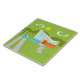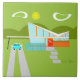 This Retro Palm Springs House with Car Ceramic Tile is a mid century modern lover’s dream. The minimalist art design features a sleek orange and glass house with a dramatically sloping checkmark shape roof. The red door offsets the orange stone planter filled with greenery and the decorative turquoise cinderblock privacy screen. Staggered concrete blocks form the perfect walkway through the lush, green lawn. A white carport offers shelter to a turquoise and white classic 1950’s car with fins. The car is perfect for driving around the green, rounded mountains in the distance. The kitschy 1960’s style house looks like a shady oasis from the hot, Palm Springs sun.