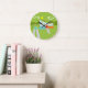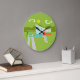 This Retro Palm Springs House with Car Round Wall Clock is a mid century modern lover’s dream. The minimalist art design features a sleek orange and glass house with a dramatically sloping checkmark shape roof. The red door offsets the orange stone planter filled with greenery and the decorative turquoise cinderblock privacy screen. Staggered concrete blocks form the perfect walkway through the lush, green lawn. A white carport offers shelter to a turquoise and white classic 1950’s car with fins. The car is perfect for driving around the green, rounded mountains in the distance. The kitschy 1960’s style house looks like a shady oasis from the hot, Palm Springs sun.