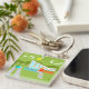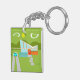 This Retro Palm Springs House with Car Square Keychain is a mid century modern lover’s dream. The minimalist art design features a sleek orange and glass house with a dramatically sloping checkmark shape roof. The red door offsets the orange stone planter filled with greenery and the decorative turquoise cinderblock privacy screen. Staggered concrete blocks form the perfect walkway through the lush, green lawn. A white carport offers shelter to a turquoise and white classic 1950’s car with fins. The car is perfect for driving around the green, rounded mountains in the distance. The kitschy 1960’s style house looks like a shady oasis from the hot, Palm Springs sun.