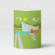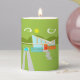 This Retro Palm Springs House with Car Pillar Candle is a mid century modern lover’s dream. The minimalist art design features a sleek orange and glass house with a dramatically sloping checkmark shape roof. The red door offsets the orange stone planter filled with greenery and the decorative turquoise cinderblock privacy screen. Staggered concrete blocks form the perfect walkway through the lush, green lawn. A white carport offers shelter to a turquoise and white classic 1950’s car with fins. The car is perfect for driving around the green, rounded mountains in the distance. The kitschy 1960’s style house looks like a shady oasis from the hot, Palm Springs sun.