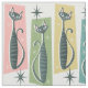 My original vector illustration of retro style patchwork tabbies and starbursts, in blue grays and pinks on hatched pink, green, yellow and blue, with an off white/tan background. I created this for the "cheater quilt" design challenge on Spoonflower. ©Christine Duffield 2019