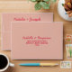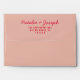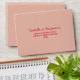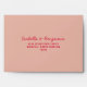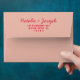 A retro modern hand written bright colorful wedding envelope. Which features bold bride and groom's names in red magenta color. And personalized return address . On simple blush peach peachy vintage color background. Which suits the whole wedding suite.