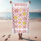Multi Custom Color and Font Style - personalized beach towel with name, happy smile face and retro checkered background and flowers. Customize all colors as you wish! Cool idea for Bridesmaid gift!