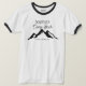 Fun personalized ringer t-shirt for your Camp Bach in the mountains. A classic summer camp style! Retro lettering in black. Personalize the bachelorette's name on top and the location at the base of the mountains. Black text and mountain accent colors.