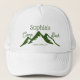 Simple personalized trucker hat for your Camp Bach in the mountains. Retro style lettering in forest green. Personalize the bachelorette's name on top and the location at the base of the mountains. Forest Green text and mountain accent colors.