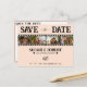 Retro wedding postcard save the date card with film strip photo collage. Light pink / peach background with wedding rings. Personalize with your personal wedding details and newlywed couple photographs.
