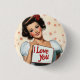 A vibrant illustration in classic 1950s pin-up style. The image features a glamorous woman with vintage curls, bold makeup, and a radiant smile. She holds a sign with a loving message, “I Love You,” set against a backdrop of delicate pink roses. The overall aesthetic captures the romantic and playful vibe of mid-century pin-up art.