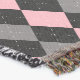A quality printed throw has its advantages. This is a much finer weave throw than its loopier cousins, and though lighter, it is worth the investment for custom room accessorizing. The back is much prettier than the typical brown, and the fringe on the long sides very vivid, the selvage nicely done. Before photographing, I washed the throw in cold water, delicate, with a thicker woven throw the same size. On tumble dry low, this throw was dry in half the time as the other. This is a very practical quality if you use throws for furniture covers or to wrap up in frequently. The sleekness of the fabric makes it a great layer for accenting or protecting without the feeling of sitting on too much stuff. Perfect for napping or when you feel a light chill coming on. The color printing is beautiful and on this fabric, matched the design and color of my Photoshop image. This is an advantage for blending room fabrics and colors. The fringe on the short sides prints the colors from the design image and therefore varies from the side fringe. I streaked a white fractal line through the plaid pattern to give the illusion of weaving. This printed as crisp as an illusory thread, and put some white in the short side fringe, showing another advantage of print vs loomed- for artistic purposes, line lines, detail, and color integrity can be planned and preserved. My loomed throws have color limitations and more of a needlepoint texture. Print throws reproduce an exact image. The throw felt a little stiff straight out of the package, but this went away in the first delicate wash. Of course I searched the wash water for ink or bleeding and there was none.