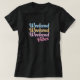 Cute retro font with colors of pink blue and yellow on t shirt for women. Quote "weekend vibes" on the shirt.