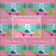 Between the pink background, turquoise mid century modern home, and the classic 1950s car, this design couldn’t be more Palm Springs if it said it in the clouds. Oh, wait, it does say it in the clouds! The blue and teal stone of the house is offset by the sputnik light fixtures framing the hot pink door. This kitschy, retro design welcomes you to live your most fabulous life.