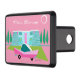 Between the pink background, turquoise mid century modern home, and the classic 1950s car, this design couldn’t be more Palm Springs if it said it in the clouds. Oh, wait, it does say it in the clouds! The blue and teal stone of the house is offset by the sputnik light fixtures framing the hot pink door. This kitschy, retro design welcomes you to live your most fabulous life.