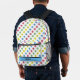 Personalize this printed backpack that has retro polka dots design with your name. The pattern has 4 colors polka dots with retro atomic symbols and a vintage printing texture. Or take off the color blocking and name for bulk order for a small store order.