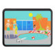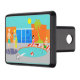 Come on in! The water is fine! This Retro Pool Party Hitch Cover features a vibrant, cartoon drawing of a fun and sophisticated pool party. The mid century modern design centers around a round swimming pool on a large, gray, concrete patio. The pool is filled with turquoise water. Orange brickwork surrounds the pool and there is a white, plank diving board all ready for an adventurous soul. A red and white beach ball is floating in the water. On the opposite side of the pool, two party-goers are dangling their feet in the water, while resting on red and white striped beach towels. The woman with black hair is wearing a pink, one-piece swimsuit. Beside her is a tropical drink in a coconut with a little umbrella and a green straw. The blond man is wearing bright, green trunks. He is kicked backed with his hands behind his head. To the left of the pool, is a distinguished man with white hair and jade swim trunks holding a drink in a coconut shell. We know he's distinguished because he's a man with white hair! He is talking to a woman with blonde hair and an hourglass figure wearing a turquoise swimsuit. Slung across her arm is a yellow beach towel> Behind this scene is the green silhouette of a palm tree and a futuristic, orange, brick house. Through the large, floor to ceiling, blue glass windows, you can see the silhouette of a television, chair, ottoman, and starburst clock. The sky behind the house is a cloudless turquoise with a round, yellow sun.