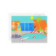 Come on in! The water is fine! This Retro Pool Party Postcard features a vibrant, cartoon drawing of a fun and sophisticated pool party. The mid century modern design centers around a round swimming pool on a large, gray, concrete patio. The pool is filled with turquoise water. Orange brickwork surrounds the pool and there is a white, plank diving board all ready for an adventurous soul. A red and white beach ball is floating in the water. On the opposite side of the pool, two party-goers are dangling their feet in the water, while resting on red and white striped beach towels. The woman with black hair is wearing a pink one-piece swimsuit. Beside her, is a tropical drink in a coconut with a little umbrella and a green straw. The blond man is wearing bright green trunks. He is kicked back with his hands behind his head. To the left of the pool, is a distinguished man with white hair and jade swim trunks holding a drink in a coconut shell. We know he's distinguished because he's a man with white hair! He is talking to a woman with blonde hair and an hourglass figure wearing a turquoise swimsuit. Slung across her arm is a yellow beach towel. Behind this scene is the green silhouette of a palm tree and a futuristic orange, brick house. Through the large, floor to ceiling, blue glass windows, you can see the silhouette of a television, chair, ottoman, and starburst clock. The sky behind the house is a cloudless turquoise with a round, yellow sun.