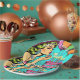Pretty blonde pinup girl lighting the candles on a birthday cake. Bright colorful retro pop art personalized birthday party plates.
