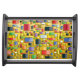 Bring a bold splash of color and vintage charm to your table with this playful geometric serving tray. A bright yellow background hosts a whimsical array of 3D-style rectangles in vibrant shades of teal, pink, purple, red, and green. The glossy pattern feels both retro and tech-inspired, while the black wood frame adds modern contrast. Perfect for parties, game nights, or anyone who loves a bit of nostalgic flair.