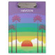 Modern colorful personalised clipboard with retro style sunset and palm trees art.