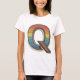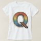 This eye-catching t-shirt design features the letter "Q" adorned with a vibrant rainbow gradient. The letter "Q" is outlined in a vintage style with a black border, and its body is filled with horizontal stripes transitioning through a spectrum of colors from red, orange, yellow, green, blue, to purple. The inner part of the letter has a detailed dot pattern that adds texture and depth to the design. This design combines a retro aesthetic with a modern twist, making it a unique and stylish addition to any wardrobe.