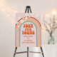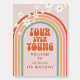 Retro Rainbow Four Ever Young 4th birthday party sign with boho daisies.