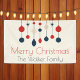Cute retro Merry Christmas party banner with vintage 70 style ornaments in red, blue, and ivory above your family name. Beautiful nostalgic holiday decor for your dinner celebration.