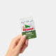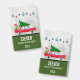 Name badge with a cool old red car carrying a green christmas pine tree on its roof and a present tucked away in the open trunk.