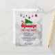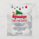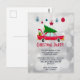 Christmas party invitation postcard with a cool old red car carrying a green christmas pine tree on its roof and a present tucked away in the open trunk.