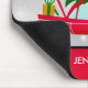 Mouse pad with a cool old red car carrying a green christmas pine tree on its roof and a present tucked away in the open trunk.