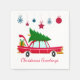 Paper napkins with a cool old red car carrying a green christmas pine tree on its roof and a present tucked away in the open trunk.