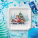 Watercolor retro red truck with Christmas pine, red ornaments and snowflakes on white for Christmas.