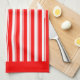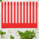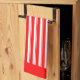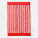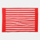 A red and white retro candy stripe pattern kitchen towel with red borders.