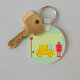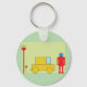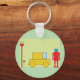 A retro looking robot standing next to a yellow car. This design looks really effective on this Keychain