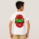 A robot head in red with a stylish green crescent shaped eye panel, a green third eye, with white teeth and highlights. He has a kind of odd sort of grin like he's discovered the wonders of some revolutionary new motor oil. From an original vector drawing by N.A. Berry. The motif is repeated on both the back and the front.