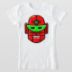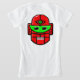 A robot head in red with a stylish green crescent shaped eye panel, a green third eye, with white teeth and highlights. He has a kind of odd sort of grin like he's discovered the wonders of some revolutionary new motor oil. From an original vector drawing by N.A. Berry. The motif is repeated on both the back and the front.