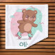 This personalized kids' wash cloth features a chubby baby bear gliding joyfully on tiny retro roller skates, leaving behind a sparkly, magical trail. This playful design is infused with a nostalgic 80s/90s aesthetic and has a soft neon pink and mint green background.